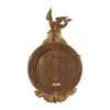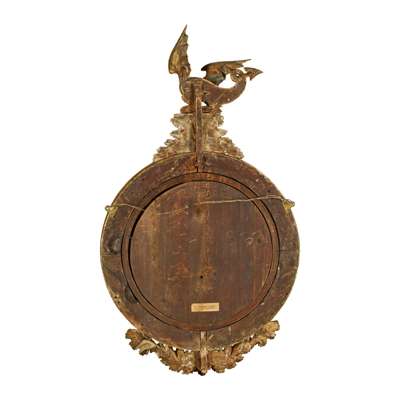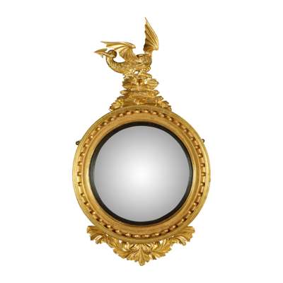 the convex mirror plate in a reeded ebonised slip and ball mounted moulded frame, surmounted by a carved dragon with an acanthus pendant finial