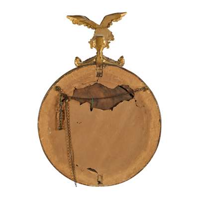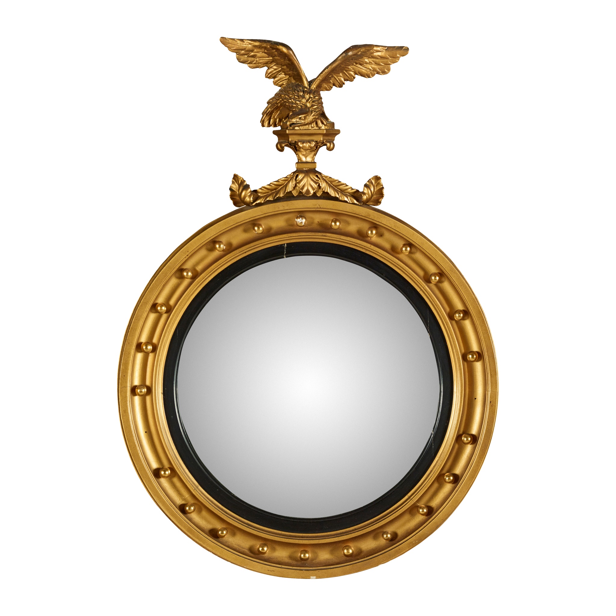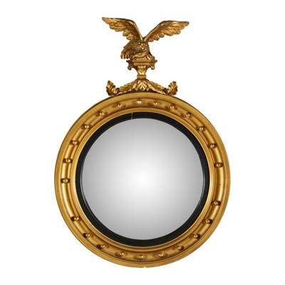 the convex mirror plate in an ebonised slip and moulded frame with ball mounts surmounted by a carved eagle and foliate cresting