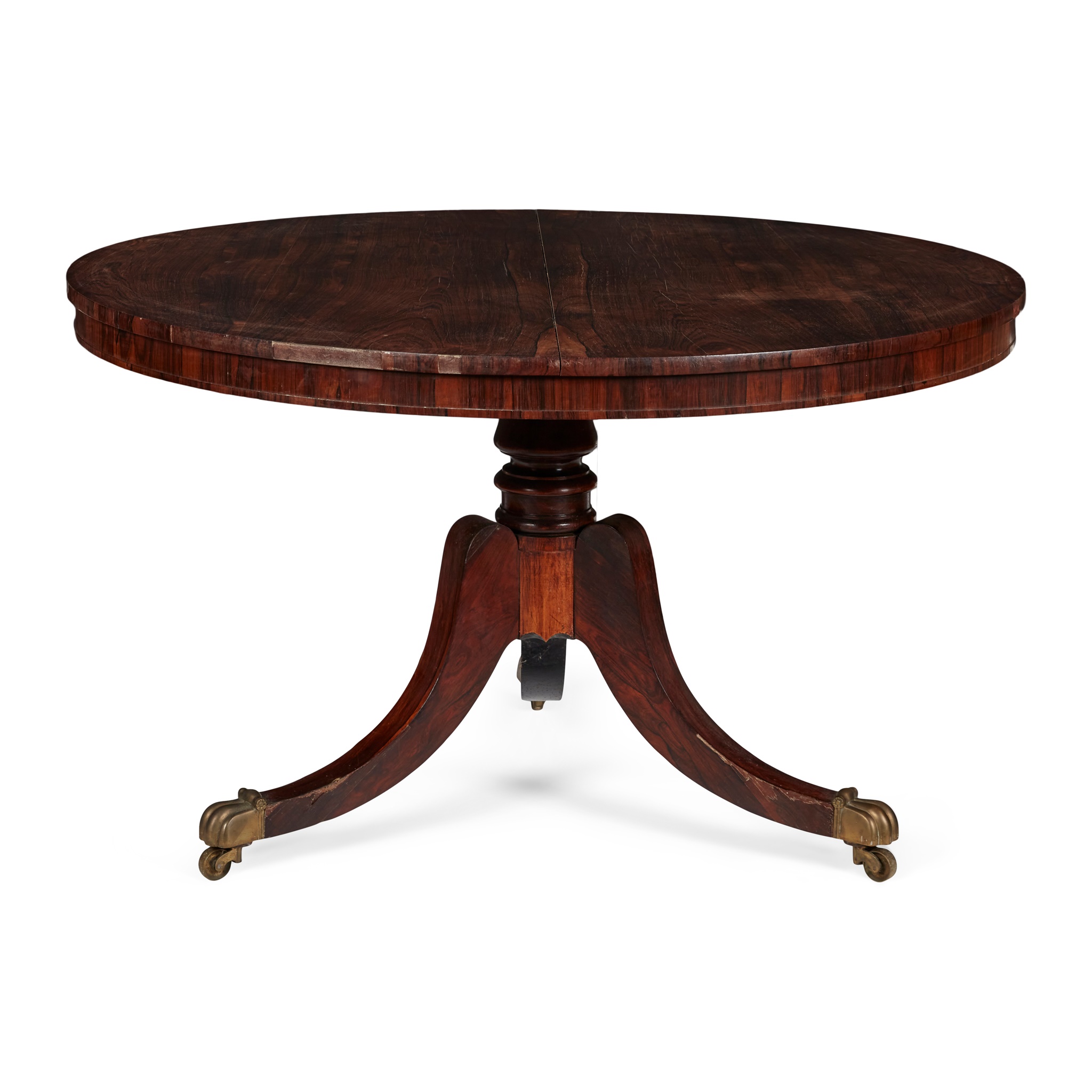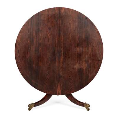 the circular tilt top raised on a ring-turned column and hipped outswept legs ending in brass paw caps and castors