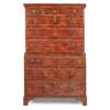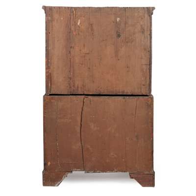 the cavetto moulded cornice above three short and three long graduated crossbanded and featherbanded drawers; the lower part with three further long drawers, the base drawer inlaid with a starburst motif, raised on bracket feet