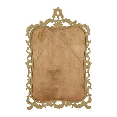 the shaped bevelled mirror plate in a pierced and carved foliate scroll frame with green painted margins