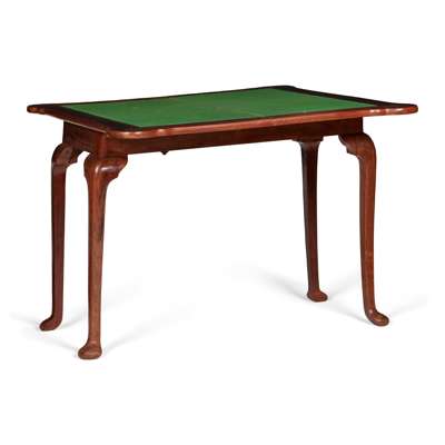 in the George II style, the fold-over top with outset rounded corners opening to a green baize playing surface, raised on cabriole legs ending in pad feet