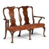 the back with twin scrolled vasiform splats above a long stuff-over seat, covered in brown plush fabric and flanked by scrolled arms, raised on shell-carved cabriole legs ending in square pad feet
