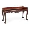 the rectangular top with a moulded edge above a scroll and foliate carved frieze centred by a shell motif, raised on cabriole legs ending in claw and ball feet