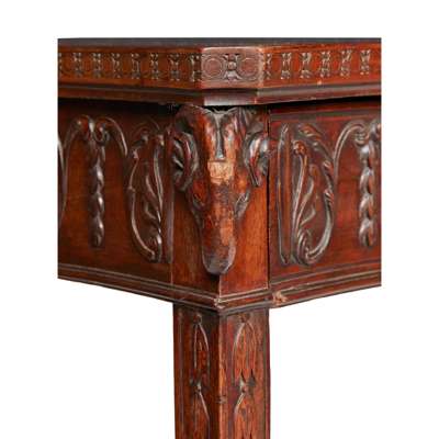 the serpentine top with a moulded edge over three frieze drawers carved with anthemions, with ram's heads to the corners, raised on husk-carved square tapered legs ending in block feet
