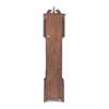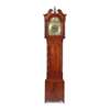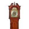 the hood with a swan neck pediment with central brass eagle finial, above an arched brass dial with silvered chapter ring, subsidiary seconds dial, twin winding holes, and signed makers boss to the arch, flanked by foliate carved columns; the trunk with an arched door flanked by foliate carved quarter columns, on a plinth base with bracket feet; the eight-day movement striking a bell
