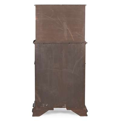 of small proportions, the superstructure with a pair of shaped and leaf-and-bead moulded doors opening to pigeon holes; the base with a secretaire drawer with pigeon holes, drawers, and a baize writing surface, over a pair of conforming panel cupboard doors opening to an adjustable shelf, raised on foliate carved ogee bracket feet