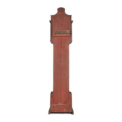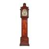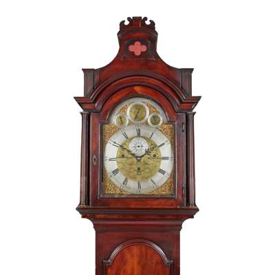 the hood with a pagoda pediment above an arched brass engraved dial with silvered chapters with Roman numerals, subsidiary seconds dial and calendar aperture, the maker's name inscribed to the arch over further dials, 'STRIKE/NOT STRIKE', 'Brittons Strike Home/Correllies Gigg’ [sic], and ‘CHIME/ NOT CHIME'; above an arched trunk door on a panelled plinth with bracket feet; the eight-day triple chain movement striking a main steel bell and chiming on eight, graduated steel bells and brass play drum