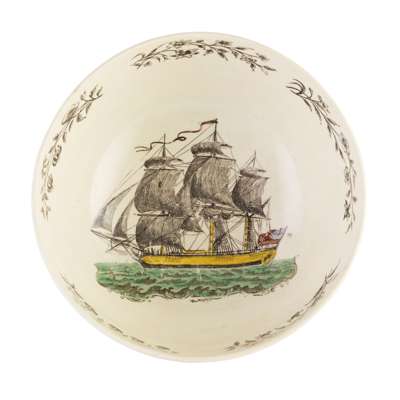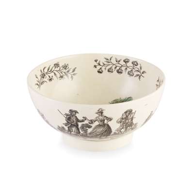 all printed in black within scroll borders of various styles; comprising 'Man Dancing to the Bagpipes', 'Two Youths and a Girl Fishing', 'The Three Horseshoes', 'A Woman Churning Butter, and a Boy', 'A Peasant Dancing to a Fiddler', 'A Suitor Offering a Present to a Girl', bearing various labels to the reverse including Jonathan Horne, Sampson & Horne Antiques, Paul Breen Collection, and Martyn Edgell Antiques; together with a LIVERPOOL CREAMWARE BOWL, transfer decorated with a ship, verse, and figure groups, 20.5cm diameter; and a copy of LIVERPOOL PRINTED TILES, by Anthony Ray, published by Jonathon Horne, USA, 1994