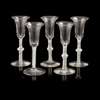 comprising a set of four glasses with trumpet bowls, the stems with a central knop, 16.5cm high; and a glass with a trumpet bowl on a plain opaque twist stem