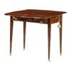 the top with serpentine drop-leaf sides and a moulded edge over a bowfront drawer to one end with a dummy drawer opposing, raised on square tapered legs ending in brass caps and castors
