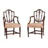 in the Hepplewhite style, the shield backs carved with husk trails and lotus, above wide serpentine stuff-over seats flanked by scrolled open arms, raised on reeded square tapered legs joined by stretchers and ending in block feet; one with carved initials HW under the stretcher