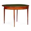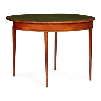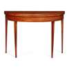 the crossbanded demilune top opening to a baize lining, raised on brass inlaid square section tapering legs