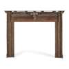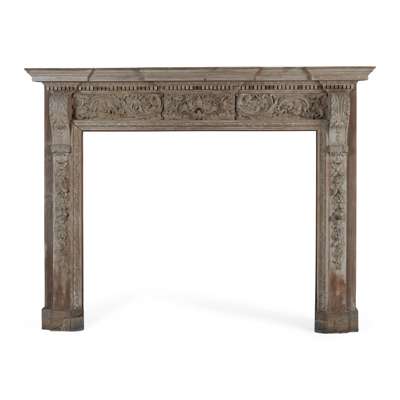 the breakfront shelf above a dentil moulded frieze carved in deep relief with foliate scrolls and flowers, the jambs carved with trailing flower garlands and capped by scrolled brackets