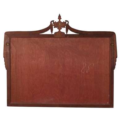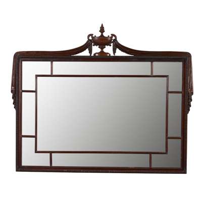 the rectangular mirror plate in a moulded frame with margin plates and surmounted by a draped urn