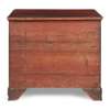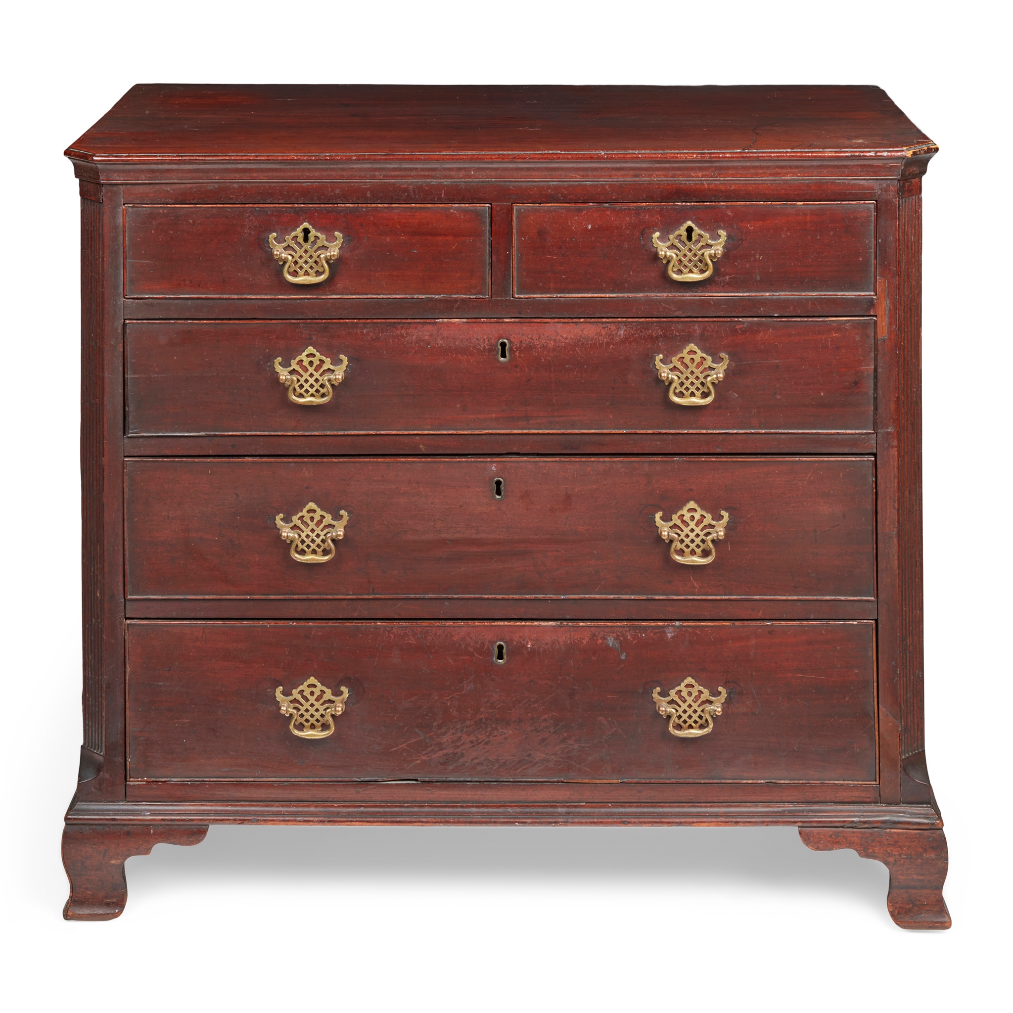 the top with canted fore corners above a pair of short and three long graduated drawers flanked by reeded angles, raised on ogee bracket feet