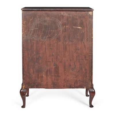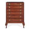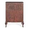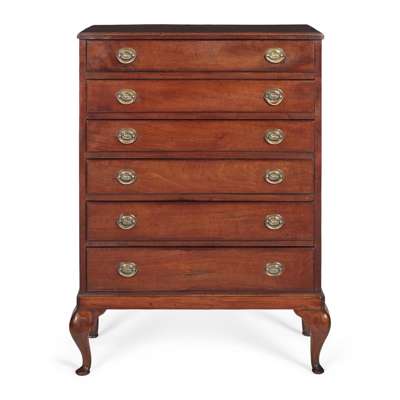 of small and unusual proportions, the top with a moulded edge above six graduated long drawers with press brass handles, raised on cabriole legs with pad feet