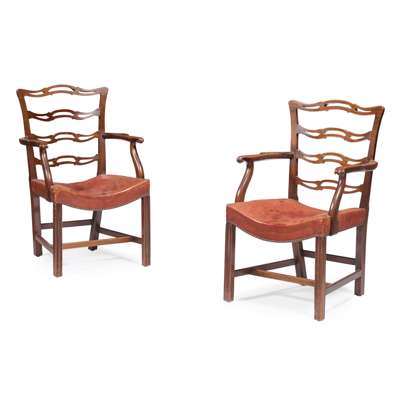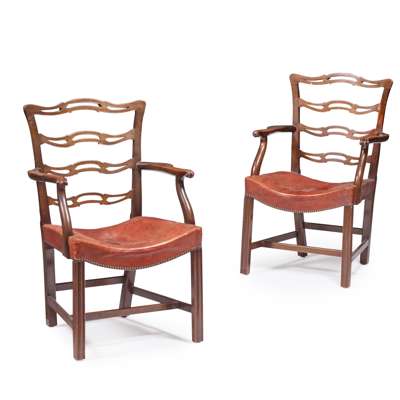 the pierced ladderbacks above curved seats covered in brown leather with brass nail head trim, raised on moulded straight square legs joined by stretchers, to include eight side chairs and four armchairs