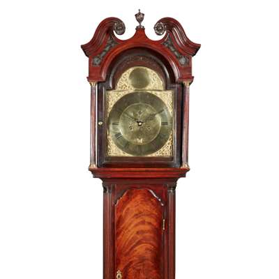 the swan neck pediment carved with flower heads and a central urn finial, above an engraved arched brass dial signed to the arch over Roman numerals and subsidiary seconds dial and date aperture, flanked by fluted columns with brass mounts above a shaped trunk door flanked by fluted quarter columns, on a plinth base with ogee bracket feet; the eight day movement striking a bell