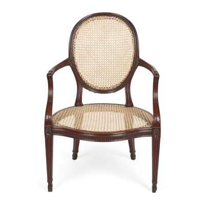 GEORGE III MAHOGANY AND CANED ARMCHAIR, IN THE MANNER OF JOHN LINNELL