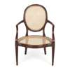 the curved oval caned back above a wide serpentine caned seat in a fluted frame flanked by down-scrolling open arms with waterleaf carved supports, raised on squared and fluted tapering legs headed by carved flowerheads