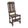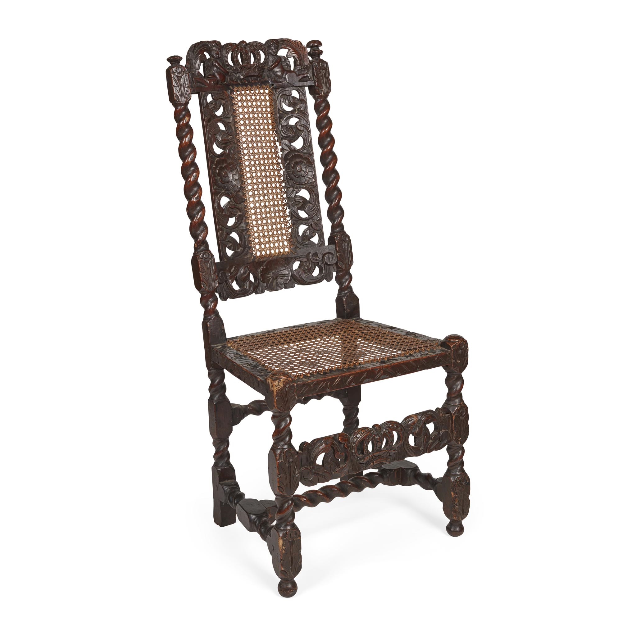 the toprail pierced and carved with a crown flanked by putti, above a caned back and seat, on spiral turned legs joined by a carved front stretcher