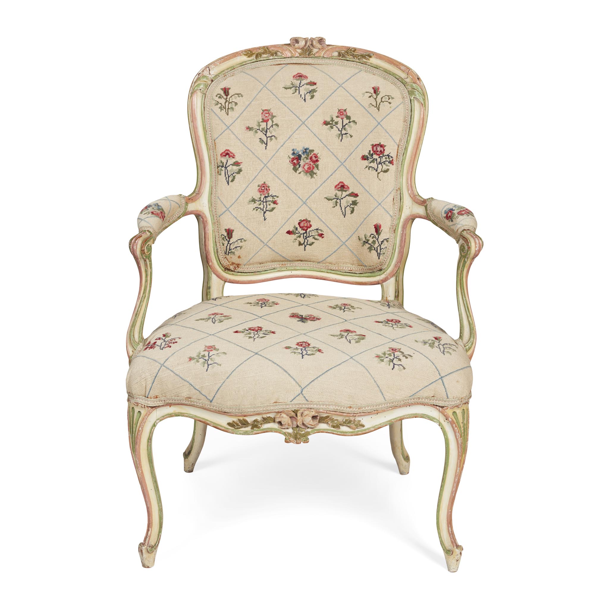 the cartouche shaped back in a flower and leaf carved moulded frame, above a wide serpentine seat flanked by part-padded arms, raised on cabriole legs with scrolled toes, the frame painted cream with pink and green details and upholstered in cream floral needlework
