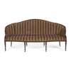 the channel moulded and fluted frame with a slightly arched back leading to enclosed arms above a serpentine padded seat, raised on eight tapered and fluted legs ending in brass caps and leather castors; covered in modern aubergine and gold plush upholstery