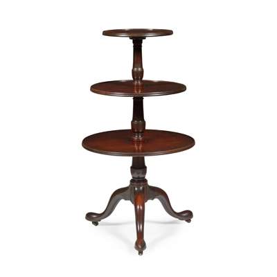 with three graduated dished tiers with reed moulded edges, raised and divided by baluster turned columns and a tripod base ending in pointed pad feet with brass castors