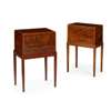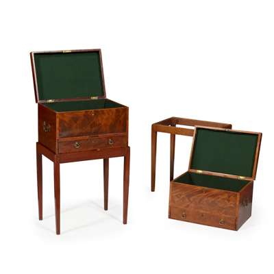 the crossbanded hinged tops opening to void interiors, now lined with baize, above base drawers with brass handles to the sides; on stands with square tapered legs