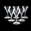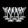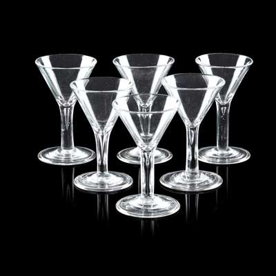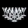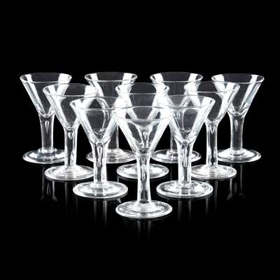 the trumpet bowls on plain extruded stems with air tears on conical circular folded foot; comprising nine large wine glasses, ten smaller wine glasses, and six liqueur glasses