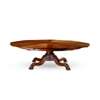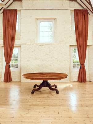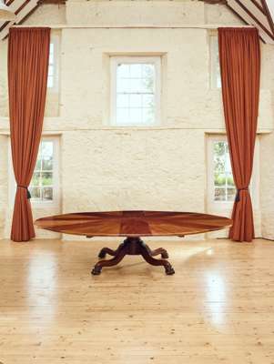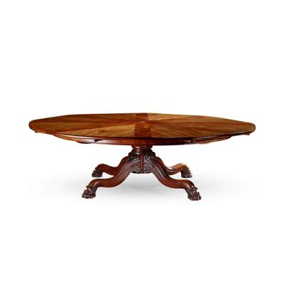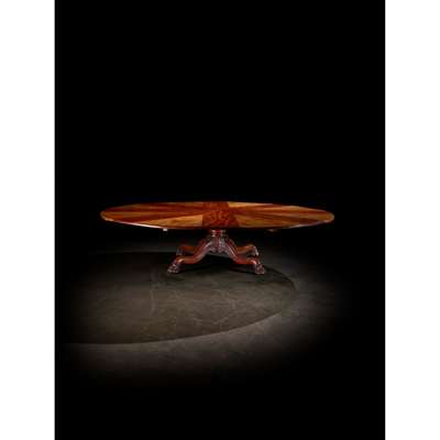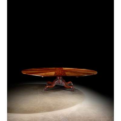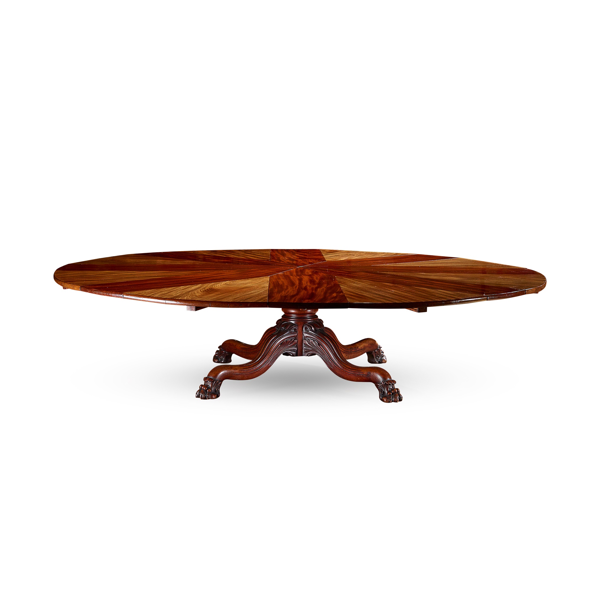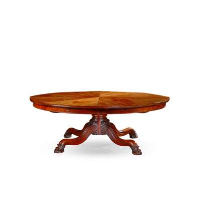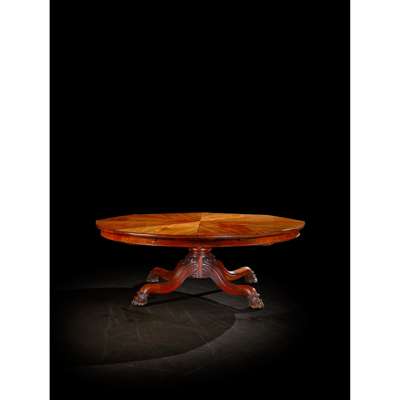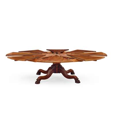Note: In March 1835 Robert Jupe, an upholsterer based at 47 Welbeck Street, Cavendish Square, London, applied for a patent on an ‘improved expanding table’ that was ‘so constructed that the sections composing its surface may be caused to diverge from a common center and that the spaces caused thereby may be filled up by inserting leaves or filling pieces’. From 1835-1840 Jupe was in partnership with John Johnstone of New Bond Street and the company traded under the name Johnstone, Jupe & Co. The partnership dissolved after 1840, and each man set up on his own, each selling tables with Jupe’s patent mechanism but under different trade names, Jupe under his own name and Johnstone with a new partner Jeanes. Beautifully engineered, the genius of Jupe’s mechanism was that it enabled the table’s radial top to expand with minimal effort to accommodate two different sets of eight leaf inserts, allowing the table to transform into three different sizes. Pedestals and bases could be tailored to the wishes of the buyer, from fairly plain to more exuberantly carved examples like the present lot. Other closely related Jupe tables are on record, all with the distinct leaf-carved quadripartite base and lion paw feet as the present model. Although of the same design, many are marked with various combinations of Jupe and Johnstone’s company’s names, an interesting detail as the partnerships changed within such a short period. See C. Gilbert, Pictorial Dictionary of Marked London Furniture 1700-1840, fig. 535.