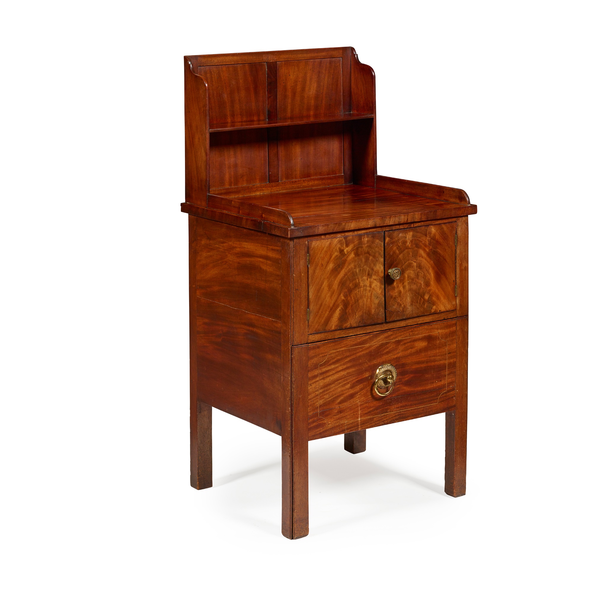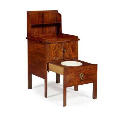 the later shelved superstructure over a pair of doors and pull-out base fitted with a ceramic toilet basin, raised on chamfered straight legs