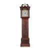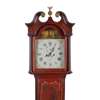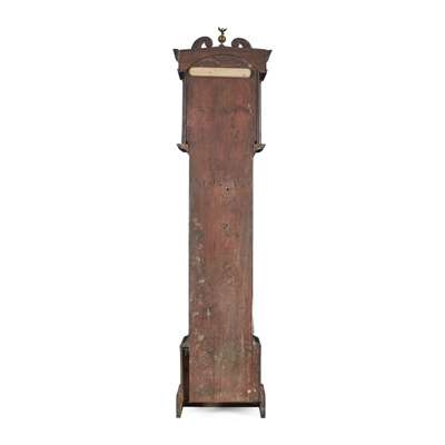 the moulded swan neck pediment with brass mounts above an arched painted Roman numeral dial, with subsidiary seconds dial and date aperture, the arch painted with Adam and Eve in the Garden, flanked by fluted columns, above a trunk with a crossbanded shaped door flanked by quarter-columns, on plinth base; the eight-day twin chain movement striking a bell