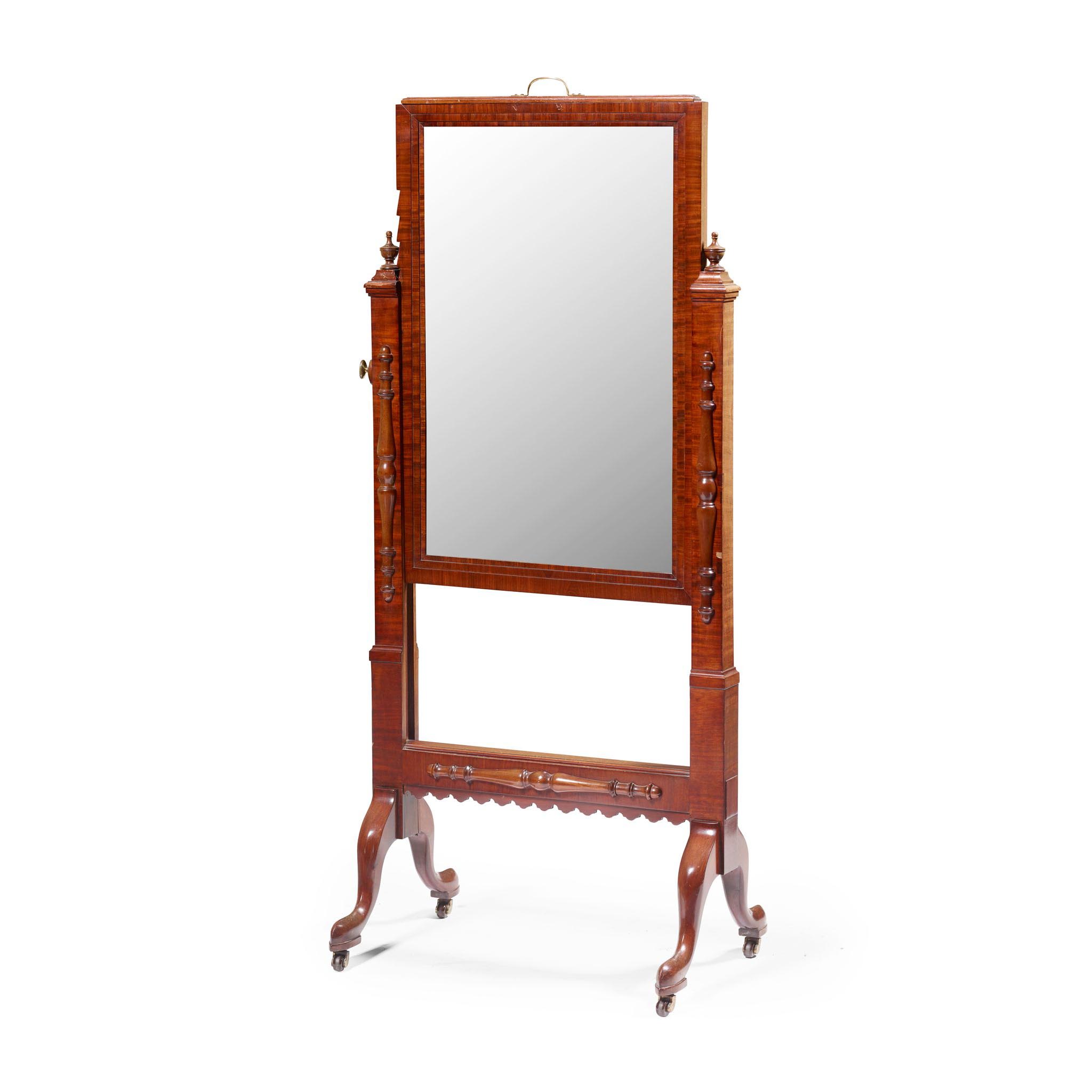 the rectangular mirror plate in a step moulded frame and rising on a ratchet mechanism, supported between squared uprights with urn finials and turned half mouldings, raised on cabriole on trestle legs with ceramic castors