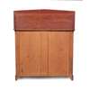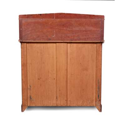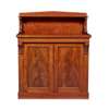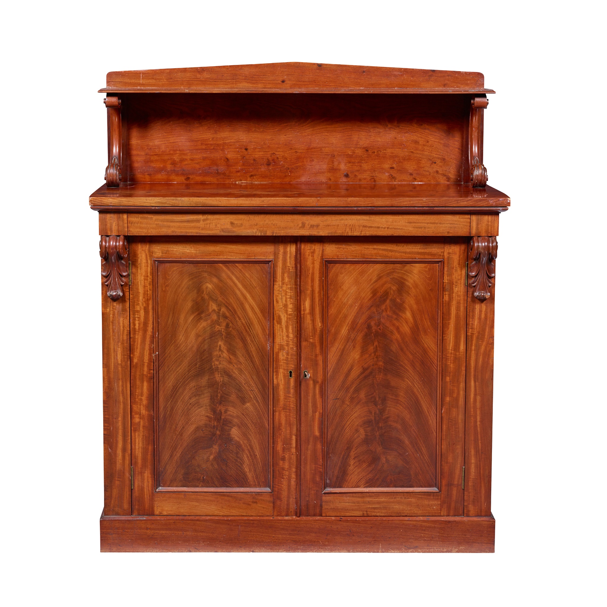 with a shelf back raised on foliate carved C-scrolls, the base with a long frieze drawer over a pair of panel cupboard doors opening to shelves, on a plinth base