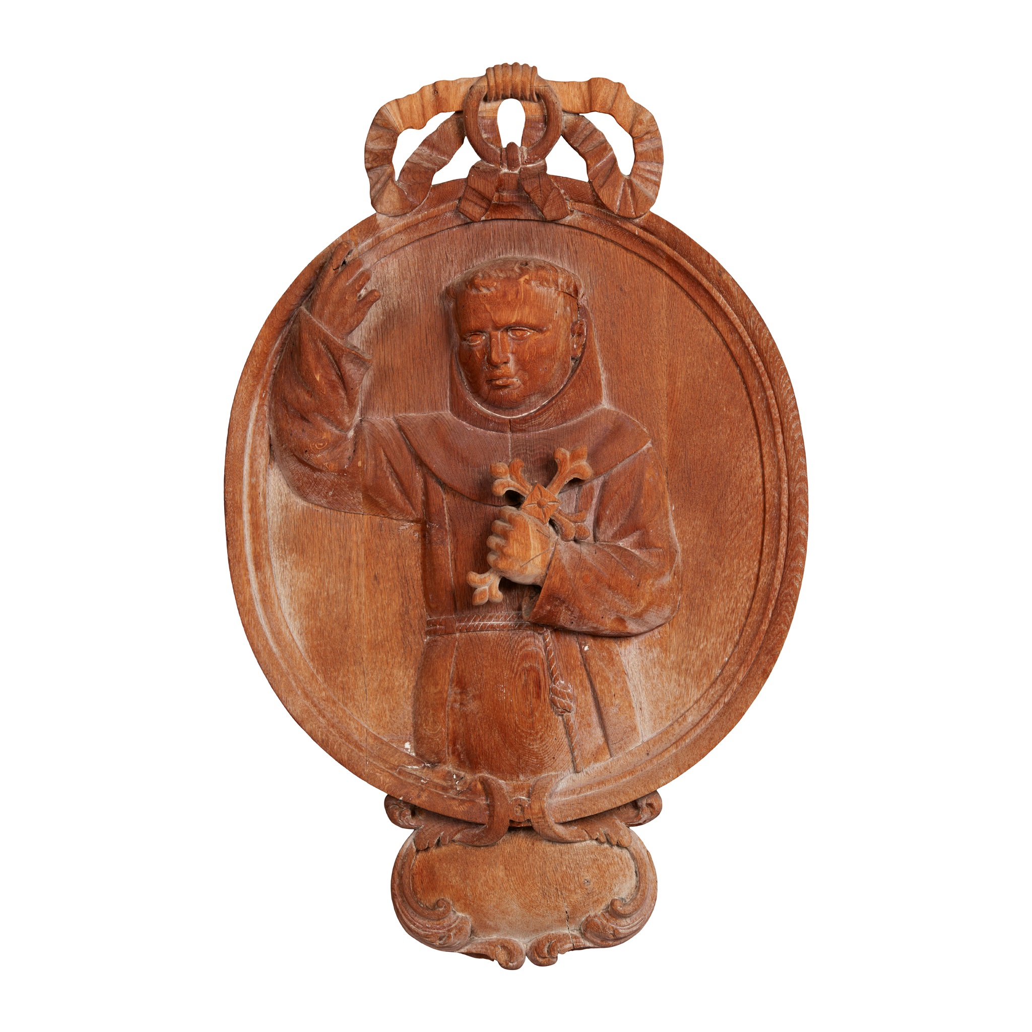 the carved ribbon-tied oval panel with a moulded border and a three-quarter relief figure of Saint Francis holding a crucifix with a blank cartouche below