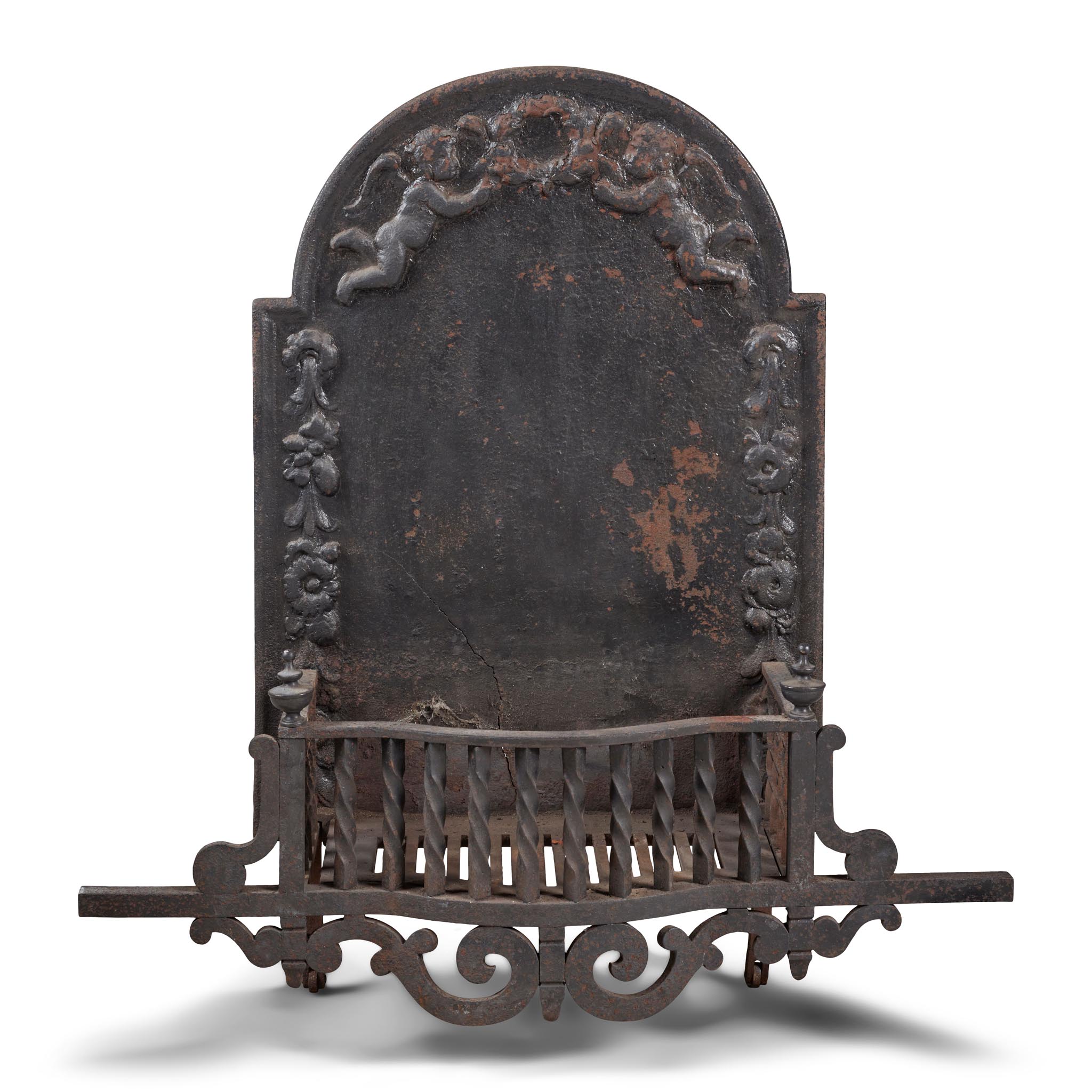 the arched back cast with a pair of putti and a laurel wreath with flower trails to the sides, above a wrought iron twisted spindle grate