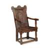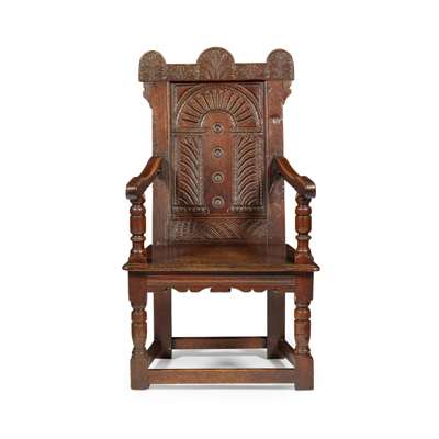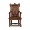 the panel back carved with stylised leaves, palmettes, and roundels above a plank seat flanked by downward scrolled arms, raised on baluster turned legs joined by peripheral stretchers