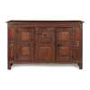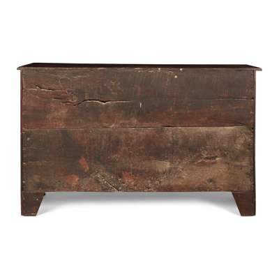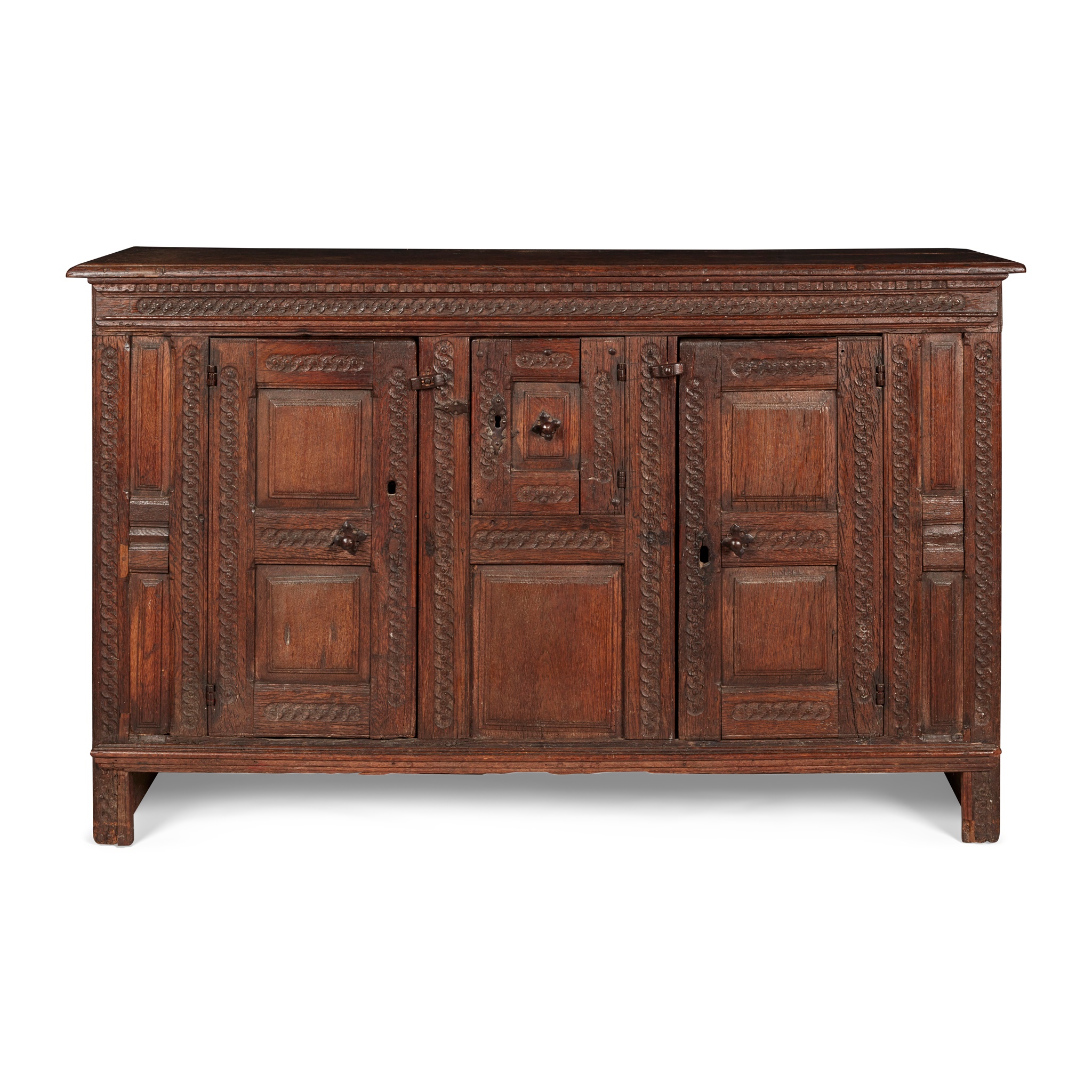 the single board top with a thumbnail moulded edge over a dentil and flowerhead carved raised, above a central cupboard door and panel flanked by carved panelled doors, raised on stile feet