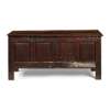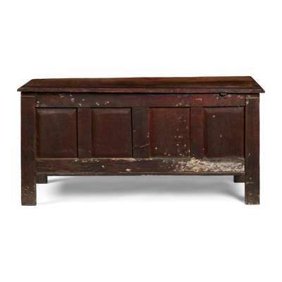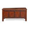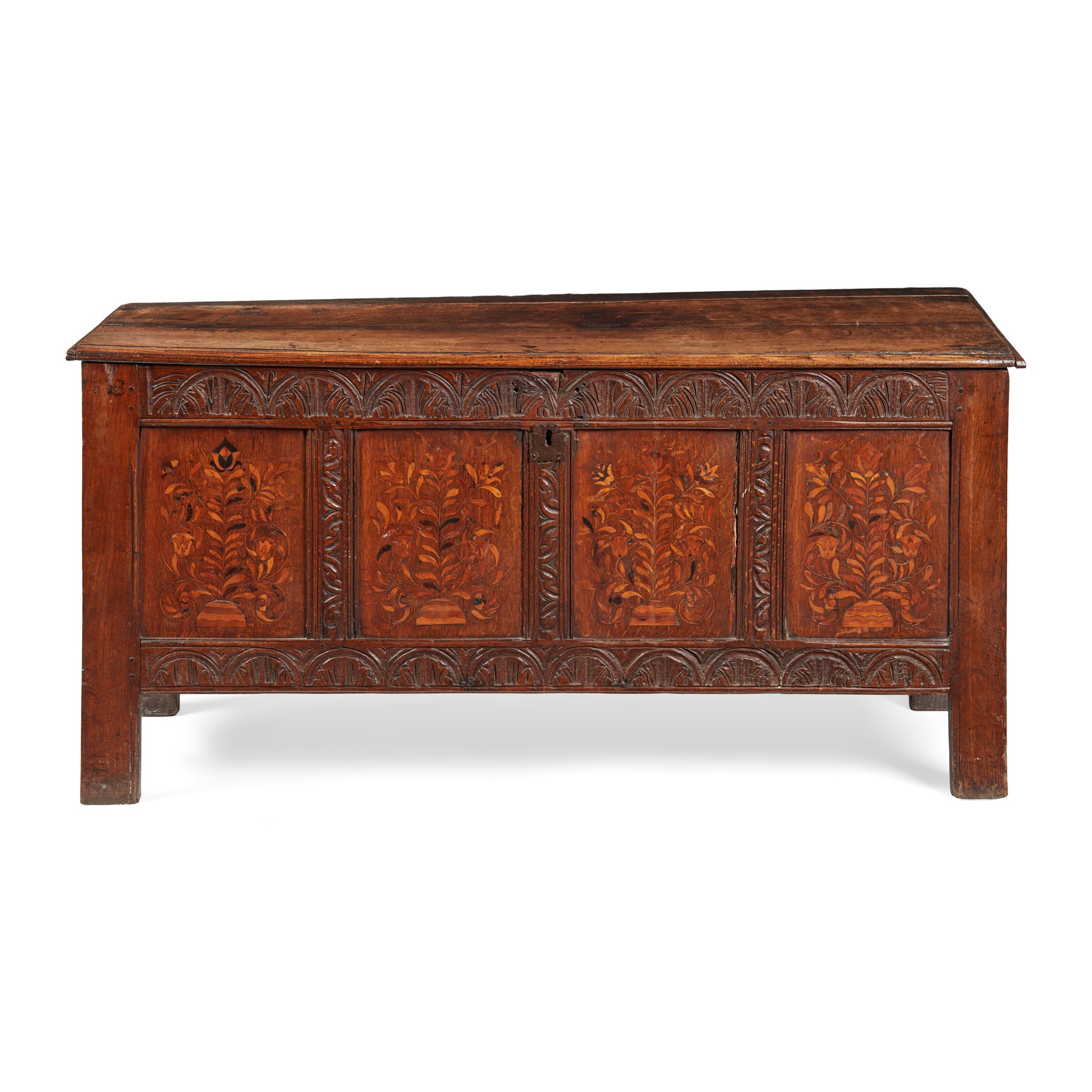 the hinged lid above a four-panel carved and floral marquetry inlaid front, raised on stile feet
