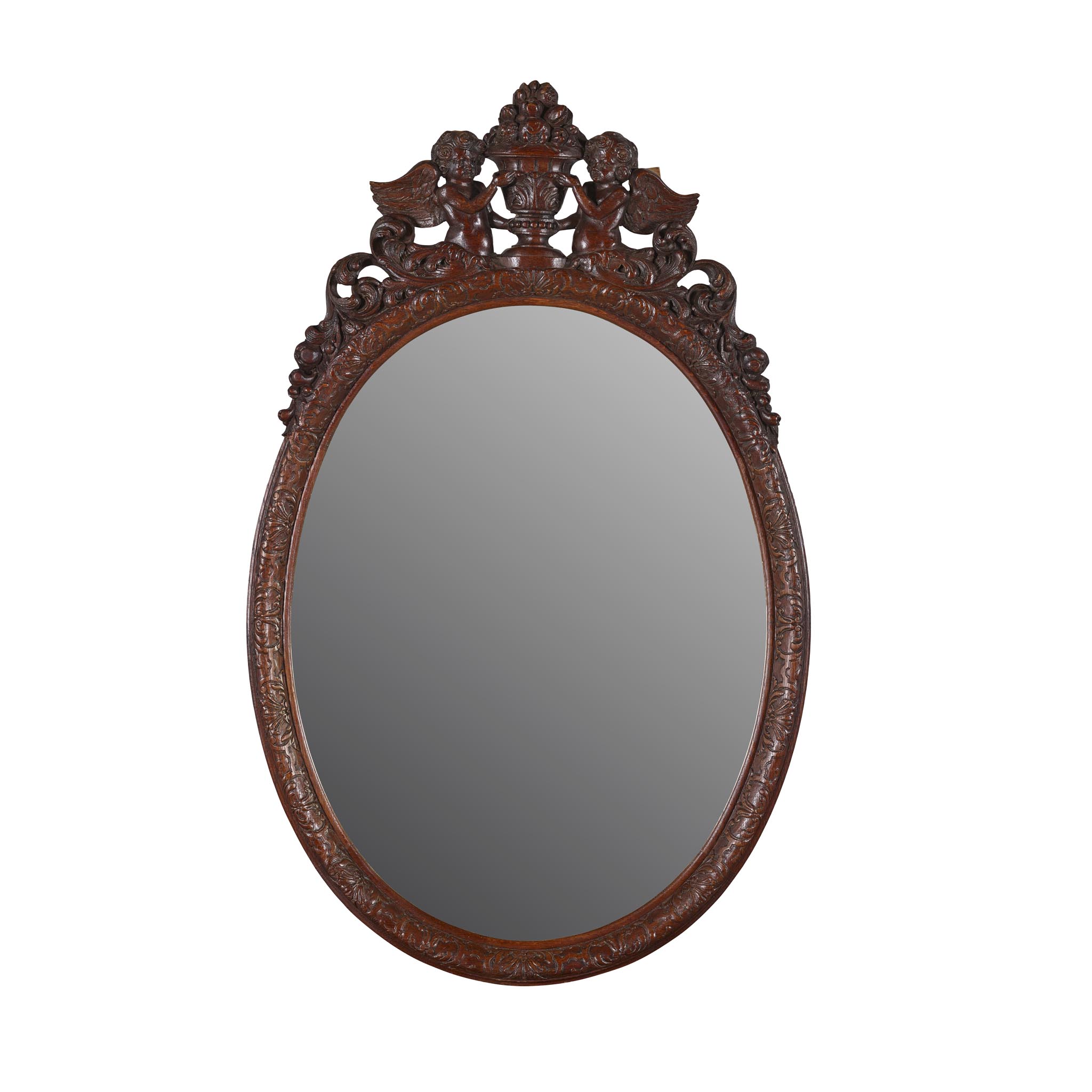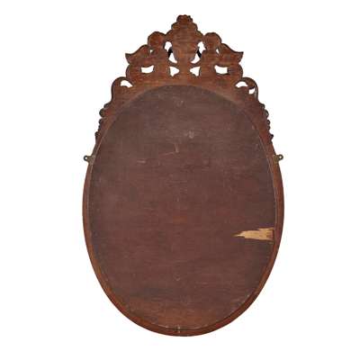 the oval mirror plate in a foliate carved frame surmounted by a fruit-filled urn flanked by putti