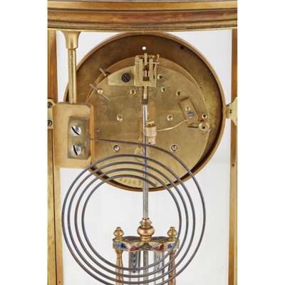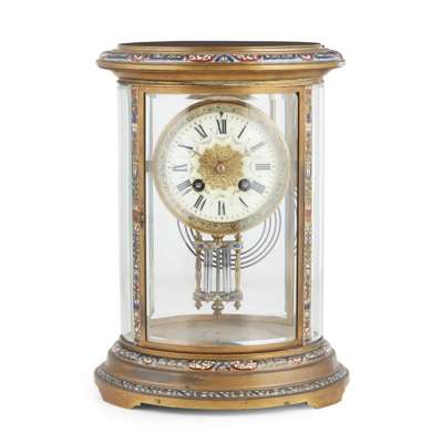 FRENCH OVAL FOUR-GLASS BRASS AND CHAMPLEVÉ ENAMEL MANTEL CLOCK, JAPY FRÈRES, PARIS