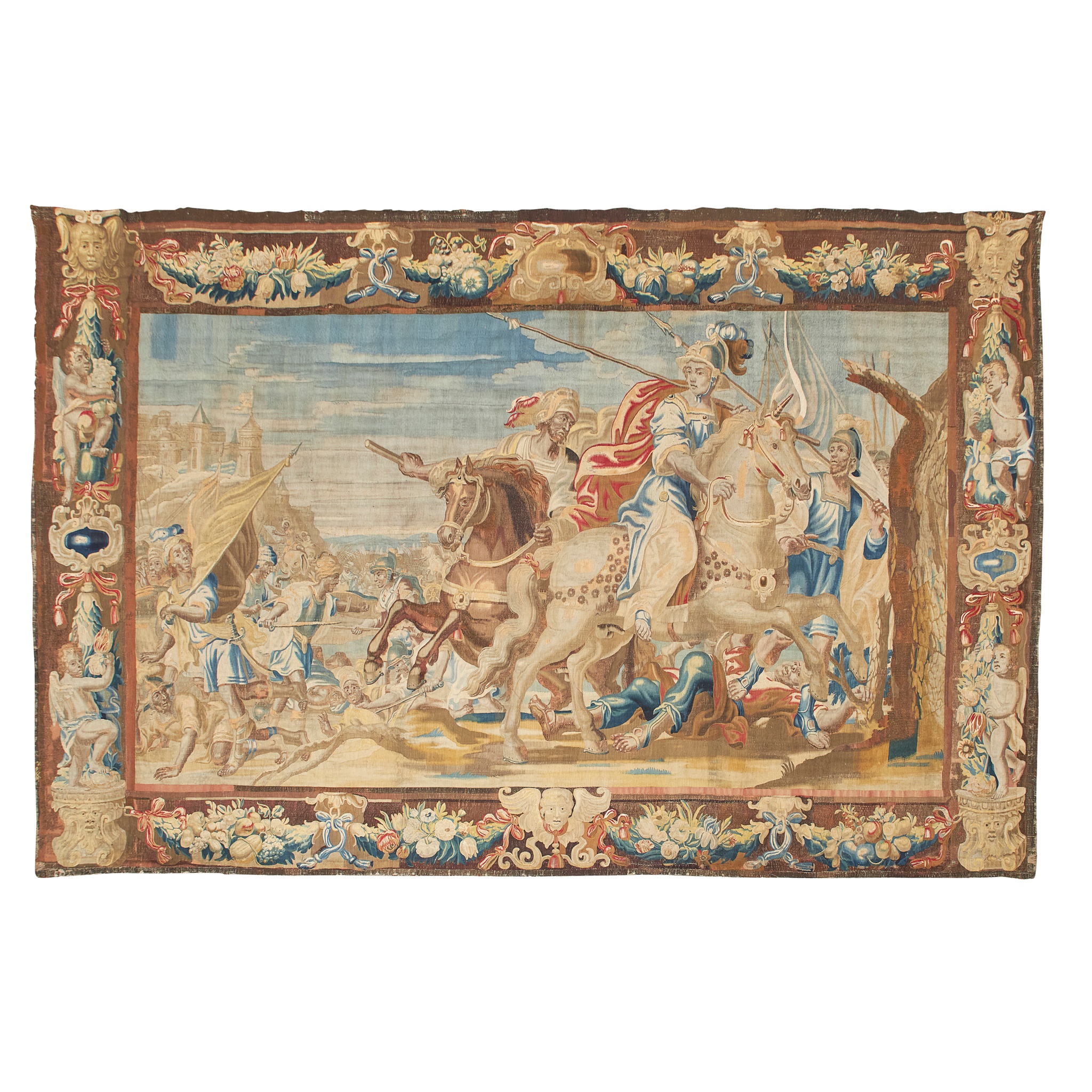 Note: The scene most likely depicts the Battle of Emesa, and shows Zenobia, queen of the Palmyran empire, dressed as a warrior on horseback, accompanied by general Zabdas as her army battles with the army of Roman emperor Aurelian. The series from which this tapestry is taken is not well researched, but does appear in several early 20th century references on Brussels tapestries. A version of this scene is included in Johann Böttger, Tapisseries à Figures des XVIe et XVIIe siècles appartenant aux collections privées de la Suède, 1928, and the same tapestry is reproduced in Marillier, English Tapestries of the 18th Century, 1930. Marillier mistakenly attributed all Wauters tapestries to an English origin. A set of tapestries on the same subject, which may be the one of the current lot, is listed in the papers of the Forchoudt family firm of 17th century art dealers, who list the designer as 'van Houbraten', Jean Denucé, Kunstuitvoer in de 17de eeuw te Antwerpen. De Firma Forchoudt, Antwerp, 1936.