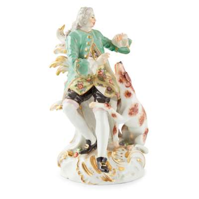 modelled seated wearing a green jacket, his hound staring up at him, on a moulded rocaille scroll base with gilt highlights; underglaze blue crossed swords with dot, incised 1476