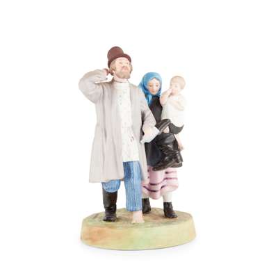 the man modelled holding an empty bottle and wearing one boot, his wife alongside, holding his boot and her child, and looking forlorn; on a naturalistic round plinth base; red printed factory mark, impressed 15