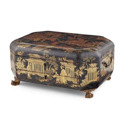 of octagonal form decorated with figural scenes in gardens and pavilions, the compartmented interior fitted with ivory accessories, raised on carved gilt paw feet