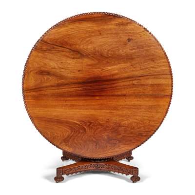 the circular tilt top with a gadrooned edge above a fruiting vine carved frieze, raised on a substantial fluted, foliate and lotus carved baluster column and quadripartite base with carved bun feet with brass castors