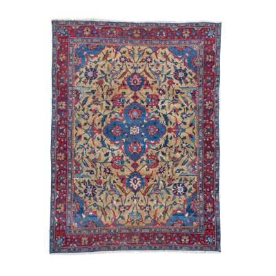 the camel field with indigo medallion suspending pendants, similar spandrels, within red border