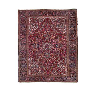 the red field with indigo medallion, ivory spandrels, within indigo border
